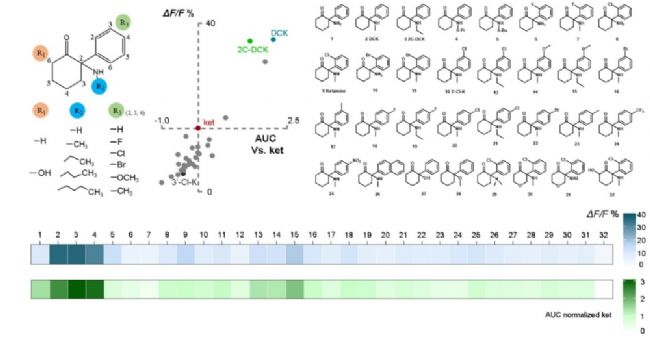 基于對(duì)上述機(jī)制的深入理解,研究者以“增強(qiáng)腺苷釋放”為表型指標(biāo),設(shè)計(jì)并篩選了一系列氯胺酮衍生物。其中,去氯氯胺酮在低劑量下即能誘發(fā)更強(qiáng)、更持久的腺苷信號(hào),并在行為學(xué)測(cè)試中表現(xiàn)出優(yōu)于氯胺酮的抗抑郁功效,同時(shí)其引發(fā)的運(yùn)動(dòng)亢進(jìn)副作用顯著減弱。值得注意的是,化合物的腺苷釋放效能與其對(duì)NMDA受體的抑制強(qiáng)度并無(wú)顯著相關(guān)性,提示其抗抑郁作用存在獨(dú)立于NMDAR抑制的新機(jī)制。