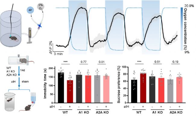 此外,研究者探索了非藥物手段提升腦內(nèi)腺苷的治療潛力。研究發(fā)現(xiàn),一種可控的急性間歇性低氧干預(yù)方案,能夠安全地誘發(fā)內(nèi)側(cè)前額葉皮層內(nèi)的腺苷釋放,并在抑郁模型小鼠中產(chǎn)生依賴(lài)于A1和A2A受體的快速抗抑郁效應(yīng)。