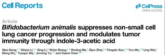 Song Q, Li X, Li Q, Shang S, Ma S, Zhai Z, Sun F, Mo Y, Wei L, Wu M, Ma Y, Yu J, Chen D. Bifidobacterium animalis suppresses non-small cell lung cancer progression and modulates tumor immunity through indole-3-acetic acid. Cell Rep. 2025 Aug 12;44(8):116132.doi: 10.1016/j.celrep.2025.116132.