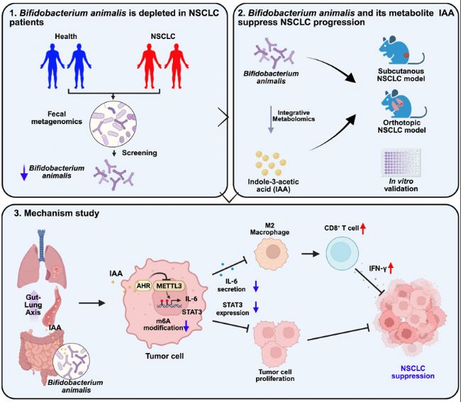 近年相關(guān)研究表明,腸道菌群及其代謝產(chǎn)物在NSCLC發(fā)生發(fā)展中具有重要作用。本研究發(fā)現(xiàn),NSCLC患者與健康對照者的腸道菌群組成存在顯著差異,尤其動(dòng)物雙歧桿菌(B. animalis)在NSCLC患者中顯著減少。B. animalis在兩種NSCLC小鼠模型和NSCLC細(xì)胞系中均能抑制腫瘤進(jìn)展,研究整合代謝組學(xué)進(jìn)一步揭示,吲哚-3-乙酸(IAA) 是B. animalis的關(guān)鍵代謝物,存在顯著抗NSCLC活性。具體而言,B. animalis及其IAA通過激活肺部芳香烴受體(AHR),抑制METTL3介導(dǎo)的STAT3 m6A甲基化;同時(shí)通過抑制IL-6減少M(fèi)2型巨噬細(xì)胞極化并增強(qiáng)CD8+ T細(xì)胞功能,從而通過腸-肺軸調(diào)節(jié)抗腫瘤免疫。B. animalis與IAA的補(bǔ)充為NSCLC預(yù)防提供了潛在策略。
