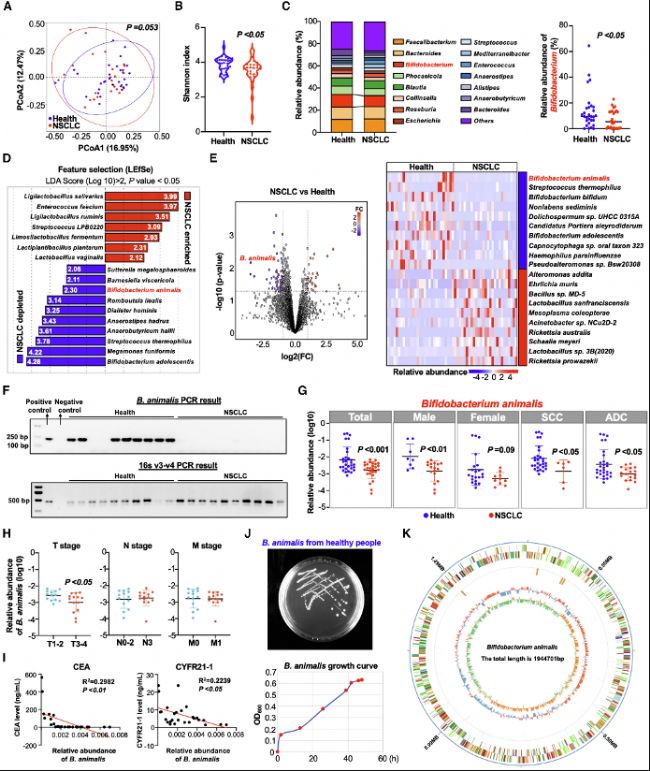 本研究通過宏基因組學(xué)分析發(fā)現(xiàn),NSCLC患者腸道菌群多樣性降低,且B. animalis在患者組中顯著缺失。主坐標(biāo)分析(PCoA)顯示患者與健康對照的微生物組成存在差異,而線性判別分析(LEfSe)進(jìn)一步確認(rèn)B. animalis是NSCLC相關(guān)的缺失菌種。通過PCR驗(yàn)證,B. animalis在患者糞便中的豐度與腫瘤標(biāo)志物(如CEA和CYFR21-1)呈負(fù)相關(guān),提示其可能作為NSCLC的生物標(biāo)志物。這一結(jié)果奠定了研究的基礎(chǔ),表明腸道菌群失調(diào)與NSCLC發(fā)生相關(guān)。