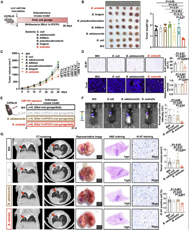 動(dòng)物模型實(shí)驗(yàn):皮下接種LLC細(xì)胞的異種移植模型和原位注射CMT167-Luc細(xì)胞的原位模型,通過灌胃給予B. animalis或其代謝產(chǎn)物IAA,評估腫瘤體積、重量和免疫細(xì)胞浸潤。