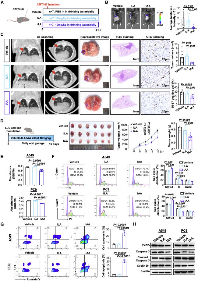 在CMT167原位和和皮下NSCLC小鼠模型中,IAA處理顯著抑制腫瘤生長,表現(xiàn)為腫瘤熒光強(qiáng)度減弱和腫瘤體積縮小。體外實(shí)驗(yàn)也證實(shí)IAA能抑制NSCLC細(xì)胞的增殖,促進(jìn)細(xì)胞周期阻滯和凋亡,并下調(diào)增殖相關(guān)蛋白(如PCNA和cyclin D1)的表達(dá)。這些結(jié)果驗(yàn)證了IAA能復(fù)制B. animalis的抗腫瘤作用,強(qiáng)調(diào)了代謝物在機(jī)制中的核心地位。
