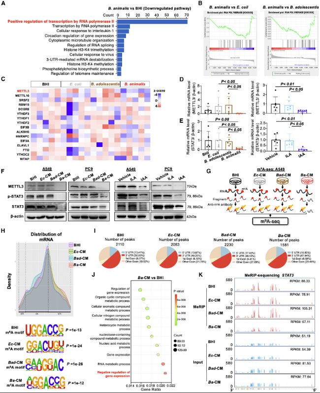 (K) 在BHI、Ec-CM、Bad-CM和Ba-CM中,STAT3的歸一化m6A reads密度水平。Ba-CM處理后STAT3 mRNA的m6A peaks顯著減少。