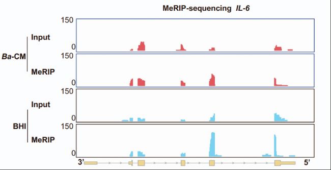 圖8:m6A MeRIP-seq測序分析顯示,Ba-CM顯著減少IL-6 mRNA的m6A peaks。