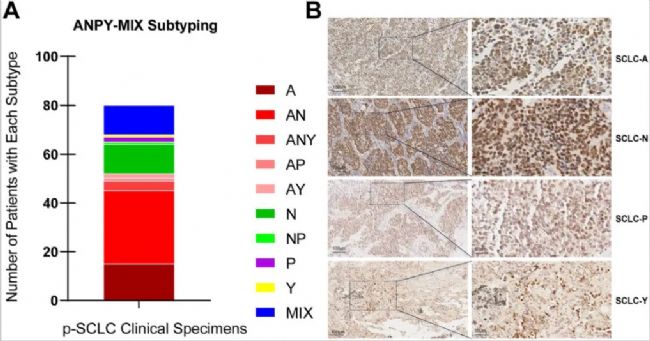 研究團(tuán)隊(duì)收集了80例p-SCLC患者的手術(shù)病理組織樣本,通過免疫組化(IHC)方法劃分為5種亞型(SCLC-A/N/Y/P和混合型,圖1A)。通過Western blot(WB)對(duì)14種SCLC細(xì)胞系模型進(jìn)行了亞型分析,然后通過WB和流式細(xì)胞術(shù)(FCM)檢測(cè)了這些細(xì)胞系模型中HLA-I、HLA-II和抗原呈遞機(jī)制(APM)的細(xì)胞表面表達(dá)。結(jié)果發(fā)現(xiàn),SCLC-A和SCLC-N亞型細(xì)胞系的HLA-I及其相關(guān)APM的表達(dá)水平低于SCLC-P和SCLC-Y亞型細(xì)胞系,所有細(xì)胞系的HLA-II及其相關(guān)APM的表達(dá)水平相似。
