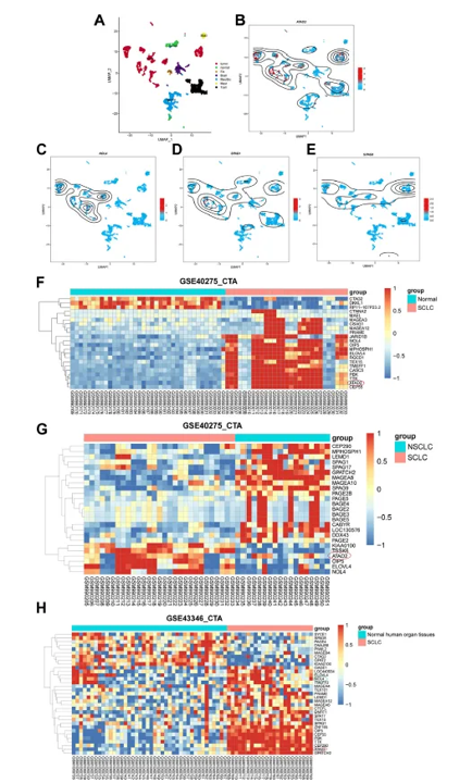 本研究對(duì)11個(gè)SCLC細(xì)胞系提取的HLA-I呈遞多肽進(jìn)行了LC-MS/MS分析(圖2A),通過PEAKS® DeepNovo Peptidome工作流,與uniprot和swissprot人類序列數(shù)據(jù)庫進(jìn)行匹配,結(jié)果共檢測(cè)到99個(gè)CTA,其中有6個(gè)是所有細(xì)胞系共有的(圖2B):ATAD2、NOL4、POTEE、SPAG1、SPAG8 和 TEX15。此外,scRNA-seq數(shù)據(jù)顯示,與細(xì)胞系模型相比,臨床SCLC實(shí)體腫瘤樣本中檢測(cè)到了4種CTA:ATAD2、SPAG1、SPAG8 和 NOL4(圖2C-D)。