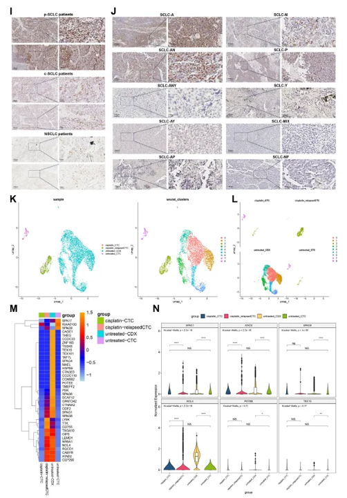 為了探究ATAD2在疾病進(jìn)展過程中的表達(dá),作者又分析了SCLC患者接受順鉑治療前后,從細(xì)胞系來源的異種移植瘤(CDX)腫瘤和縱向收集的循環(huán)腫瘤細(xì)胞(CTC)中的scRNA-seq數(shù)據(jù)(GSE138267)。CTC的系列scRNA-seq分析顯示,其轉(zhuǎn)錄異質(zhì)性與配對(duì)CDX相似(圖4K、L)。ATAD2和NOL4在未經(jīng)治療的CDX和順鉑耐藥后患者的CTC中表達(dá)最高,而在未經(jīng)治療的CTC和對(duì)順鉑有反應(yīng)的腫瘤患者的CTC中,這些基因的表達(dá)較低(圖4M)。未經(jīng)治療的CDX腫瘤中的ATAD2、NOL4和SPAG1表達(dá)水平高于未經(jīng)治療的CTC,但接受順鉑治療的應(yīng)答患者CTC中的ATAD2、NOL4和SPAG1表達(dá)水平低于接受順鉑治療的耐藥患者CTC中的ATAD2、NOL4和SPAG1表達(dá)水平(圖4N)。這些數(shù)據(jù)表明ATAD2的表達(dá)是動(dòng)態(tài)的,會(huì)隨著SCLC的臨床病程而變化。