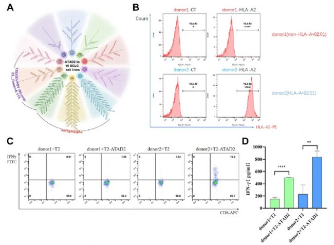 LC-MS/MS鑒定結(jié)果顯示,SCLC-A和SCLC-N SCLC細(xì)胞系模型的免疫肽數(shù)量顯著低于SCLC-P和SCLC-Y模型。c-SCLC(H2066)中的免疫肽數(shù)量也顯著低于SCLC-P/Y(圖5A)。共鑒定出106條ATAD2相關(guān)免疫肽,其中YSDDDVPSV與UniProt數(shù)據(jù)庫中ATAD2的肽序列一致,并在3種SCLC模型中均有檢測(cè)到。為了測(cè)試YSDDDVPSV能否激活T細(xì)胞,作者從兩名HLA基因型不同的正常健康志愿者體內(nèi)分離了PBMCs:HLA-A∗02:01表達(dá)和HLA-A∗02:01缺失(非HLA-A∗02:01)(圖5B)。用經(jīng)YSDDDVPSV處理的T2細(xì)胞(共9天)分別刺激HLA-A∗02:01和非HLA-A∗02:01 PBMCs,通過ICS定量分析能夠分泌IFN-γ的活化CD8+ T細(xì)胞的百分比。在HLA-A∗02:01 培養(yǎng)物中觀察到分泌IFN-γ的CD8+T細(xì)胞的百分更高(圖 5C)。進(jìn)一步通過CBA檢測(cè)培養(yǎng)上清液中的IFN-γ,發(fā)現(xiàn)HLA-A∗02:01 T細(xì)胞培養(yǎng)上清液中的IFN-γ水平高于非HLA-A∗02:01 T細(xì)胞(圖5D)。以上結(jié)果表明 HLA-A∗02:01-YSDDDVPSV免疫肽可以以HLA依賴的方式刺激T細(xì)胞活化,為進(jìn)一步研究其作為SCLC的免疫藥物靶點(diǎn)提供了依據(jù)。