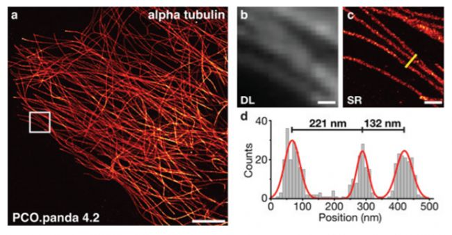 圖 2:細(xì)胞環(huán)境中的 DNA-PAINT 成像。(a) 微管用 α 微管蛋白一抗和 DNA 偶聯(lián)二抗標(biāo)記。使用非制冷型 sCMOS 相機(jī) (pco.panda 4.2) 在 TIRF 模式下進(jìn)行成像。(b) 衍射限制 (DL) 表示和圖 (c) a 中突出顯示區(qū)域的超分辨率 (SR) 放大。(d)圖 (c) 中標(biāo)記區(qū)域的橫截面直方圖顯示了三個(gè)微管中間纖維之間的距離。比例尺:5 μm (a), 500 nm (b, c)。