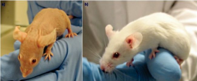 圖2. a:雌性裸鼠純合子(nu/nu),b:雌性裸鼠雜合子(nu/+)[2]