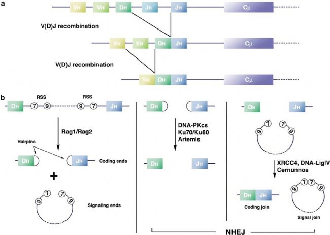 [4] Soulas-Sprauel P, Rivera-Munoz P, Malivert L, et al. V(D)J and immunoglobulin class switch recombinations: a paradigm to study the regulation of DNA end-joining. Oncogene. 2007;26(56):7780-7791. doi:10.1038/sj.onc.1210875