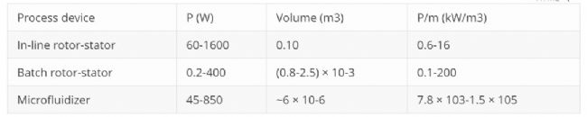 微射流均質(zhì)機(jī)的功率和比功率輸入與在線式和間歇式轉(zhuǎn)子定子所獲得的功率和比功率輸入的比較