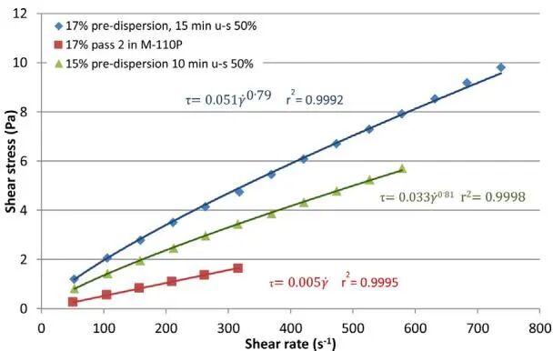 15%氣相二氧化硅在水中的預(yù)分散體以及使用微射流處理過(guò)程中的流動(dòng)曲線。