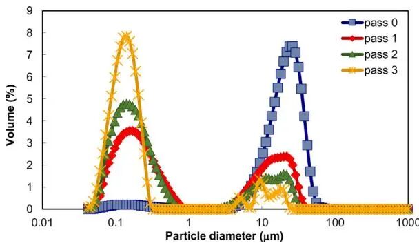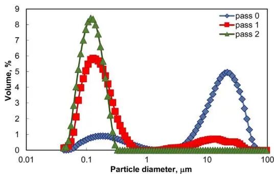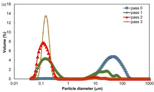 研究明確揭示了微射流均質(zhì)機(jī)破碎納米顆粒團(tuán)簇的主導(dǎo)機(jī)理為侵蝕。粒徑分布的演變顯示,處理過(guò)程中較大的團(tuán)簇尺寸逐漸減小,同時(shí)亞微米細(xì)顆粒的比例穩(wěn)步增加,這是侵蝕作用的典型特征。該機(jī)理與作者前期采用在線轉(zhuǎn)子-定子器研究同一物系的結(jié)論一致。這表明,即使在高功率密度的微射流均質(zhì)機(jī)中,