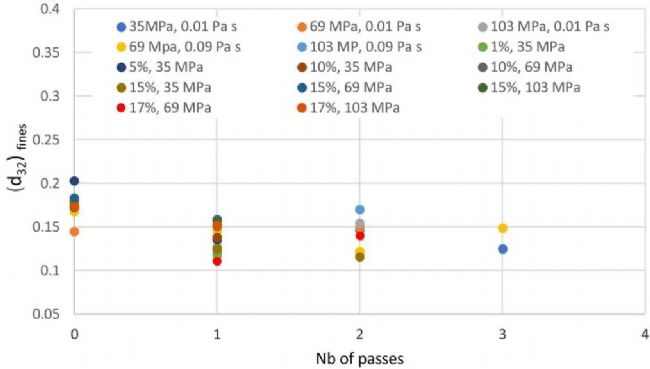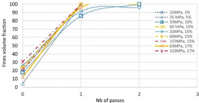 隨著固體濃度增加,微流控均質(zhì)機(jī)性能的研究結(jié)果總結(jié):在不同操作壓力下每次通過(guò)時(shí)細(xì)顆粒 的百分比