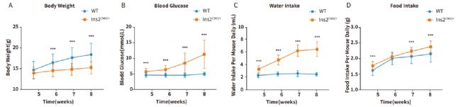結(jié)果顯示,Ins2-C96Y小鼠從4周齡開始,雜合子就表現(xiàn)出多食、多飲、高血糖、體重不增的明顯糖尿病癥狀,且癥狀隨著年齡增長而加重。