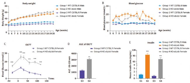 A,Lep-KO小鼠表現(xiàn)出明顯的肥胖表型(n=16);B,Lep-KO 小鼠表現(xiàn)出高血糖的癥狀(n=16);C-D,Lep-KO 小鼠表現(xiàn)出明顯的糖耐量異常(n=6,雄性,6周齡);E,Lep-KO 小鼠的胰島素水平顯著升高(n=4,20周齡)。