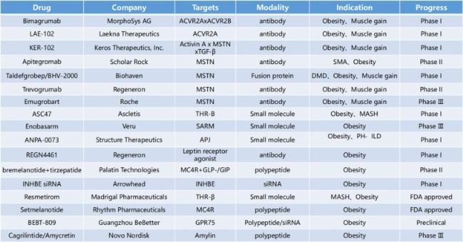 為此,新一代療法正聚焦于"減脂增肌"的雙重目標(biāo)。目前活躍的研發(fā)方向涵蓋激活素受體ACVR、肌肉生長抑素MSTN、抑制素亞基βE(INHBE)、Apelin受體APJ、甲狀腺激素受體β(THRβ)、選擇性雄激素受體調(diào)節(jié)劑(SARM)、瘦素leptin、黑色素受體MC4R、GDF15及Ghrelin受體等關(guān)鍵靶點(diǎn)。部分單靶點(diǎn)藥物或GLP-1多靶點(diǎn)聯(lián)合方案已進(jìn)入I-III期臨床試驗(yàn)階段。