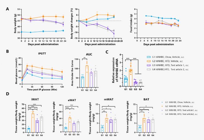 圖. INHBE siRNA藥物處理后對小鼠體重(A)、糖耐量(B)、肝臟INHBE mRNA水平(C)及各脂肪組織重量(D)的影響。結(jié)果顯示,siRNA藥物處理后,hINHBE肥胖小鼠的體重降低,糖耐量有所改善,肝臟INHBE的mRNA水平降低,脂肪含量降低。