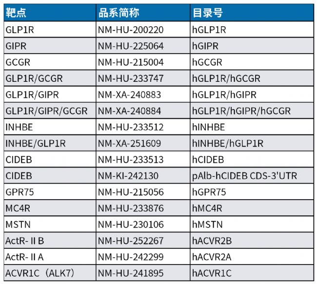 此外,南模生物開發(fā)了系列靶點(diǎn)人源化小鼠,可用于當(dāng)前肥胖疾病減脂增肌藥物的臨床前研究。部分列表如下: