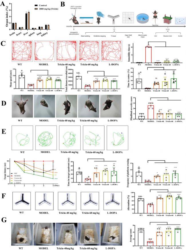 澳門(mén)科技大學(xué)的科研團(tuán)隊(duì)在上述文章中重點(diǎn)探究了天然黃酮類(lèi)化合物 Tricin(苜蓿素)對(duì)帕金森。≒D)的抑制潛力及作用機(jī)制。實(shí)驗(yàn)人員通過(guò)構(gòu)建細(xì)胞模型(PC-12、SH-SY5Y 等)、秀麗隱桿線蟲(chóng)模型和 A53T-α-突觸核蛋白轉(zhuǎn)基因小鼠模型,在多維度上驗(yàn)證了Tricin(苜蓿素)的抗PD活性。實(shí)驗(yàn)結(jié)果表明Tricin(苜蓿素)能通過(guò) AMPK-p70s6K 信號(hào)通路激活自噬流,且該過(guò)程依賴(lài)自噬相關(guān)基因 ATG7的表達(dá),并最終促進(jìn) α-突觸核蛋白(α-syn)的自噬降解;同時(shí),Tricin 可提升多巴胺(DA)水平、降低炎癥因子(IFNγ、TNFα)的釋放,改善PD 模型的認(rèn)知和運(yùn)動(dòng)缺陷。行為學(xué)實(shí)驗(yàn)(曠場(chǎng)試驗(yàn)、Morris 水迷宮等)顯示Tricin 能改善帕金森。≒D)小鼠的自主行為、空間記憶和筑巢能力,組織學(xué)染色證實(shí)Tricin 可減輕海馬體和皮質(zhì)區(qū)的神經(jīng)元損傷。與臨床 PD 藥物相比,Tricin 在緩解病理進(jìn)程和癥狀的同時(shí)無(wú)明顯副作用,有望開(kāi)發(fā)為 PD的抑制劑。上述實(shí)驗(yàn)中的核心研究對(duì)象Tricin