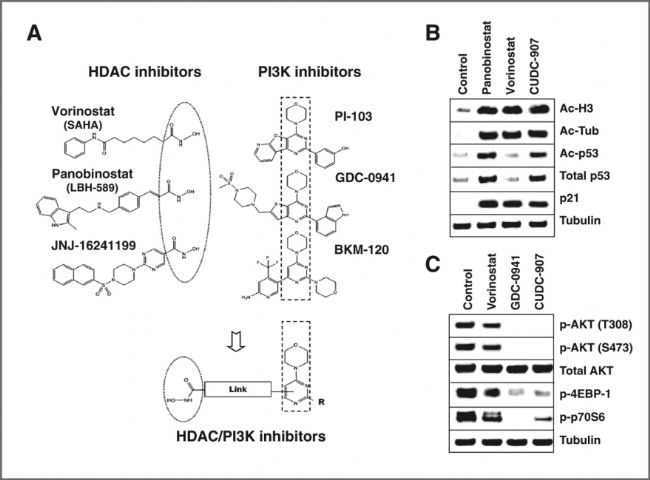 PI3K/Akt/mTOR和HDAC信號通路在多種生物學(xué)過程中存在相互交叉影響。PI3K/Akt/mTOR通路作為細(xì)胞內(nèi)重要的代謝調(diào)節(jié)器,控制著細(xì)胞生長、增殖和存活的關(guān)鍵過程;而HDAC通過調(diào)節(jié)組蛋白乙;癄顟B(tài),影響染色質(zhì)結(jié)構(gòu)和基因表達(dá)。同時抑制這兩條通路能夠產(chǎn)生協(xié)同效應(yīng)。CUDC-907的分子結(jié)構(gòu)由兩個關(guān)鍵活性結(jié)構(gòu)域構(gòu)成,分別負(fù)責(zé)與HDACs和PI3K結(jié)合,并通過“linker” 基團(tuán)連接形成雙功能抑制分子。