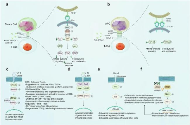 這些信號通路既是調(diào)控腫瘤生長的關鍵節(jié)點,更是介導免疫逃逸的核心分子機制,具體包括 PD-1/PD-L1、CTLA-4、TGF-β、IL-10/JAK-STAT3、NF-κB、cGAS-STING 及 PI3K/AKT/mTOR 等七大通路。它們通過各自獨特的分子調(diào)控邏輯抑制免疫應答、助力腫瘤逃逸,同時也因核心作用成為免疫治療中極具潛力的靶向突破口。