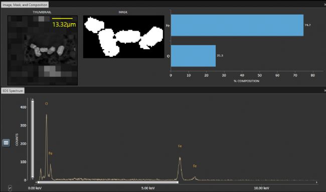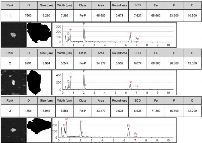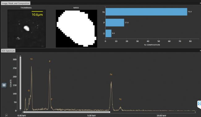 如下表所示為使用篩分法收集樣品,并使用 Phenom ParticleX 測試磷酸鐵鋰中金屬異物的結果。可以看出,在篩分法中,磷酸鐵鋰主材占據了絕大部分顆粒,其平均氧含量為 44.2%,而磷化鐵和氧化鐵的含量較少,磷化鐵中氧含量較少,僅為 10.6%,而氧化鐵中并不含有磷的成分。