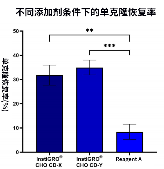 使用 VIPS PRO 對表達(dá)單克隆抗體的 CHOK-1 單細(xì)胞懸液進(jìn)行鋪板。使用商業(yè)化培養(yǎng)基 CD FortiCHO™ 配合不同的添加劑,分別為 InstiGRO CHO CD-X、InstiGRO CHO CD-Y 以及其它品牌的添加劑 Reagent A。每個條件鋪 3 塊 96 孔板(Corning® 3596)。14 天后對培養(yǎng)板進(jìn)行整孔成像,并統(tǒng)計單克隆恢復(fù)率。