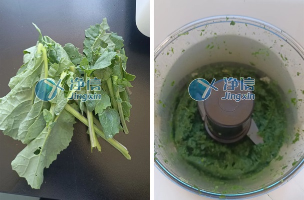 4. 將油菜葉子剪成段狀,放進研磨杯