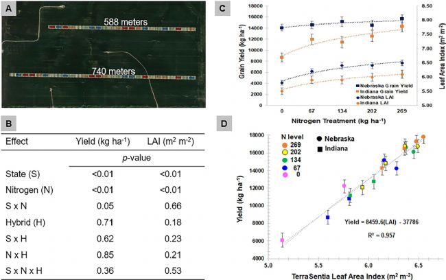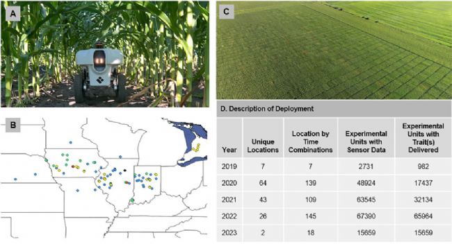 實驗團隊基于搭載多傳感器(LiDAR、攝像頭、魚眼鏡頭等)的TerraSentia機器人在5年內覆蓋美國和加拿大的142個研究地點,對近20萬個玉米實驗單元進行了數據采集,所采集的數據與傳統(tǒng)測量方法高度一致(R²>0.87),展示了其在不同環(huán)境下的可靠性和準確性。
