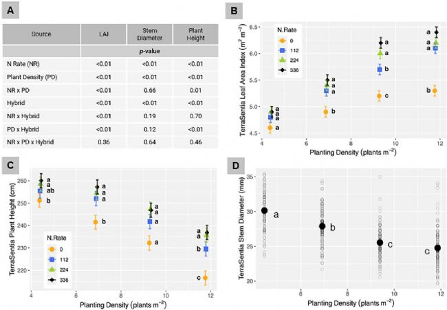 研究表明氮肥和種植密度對玉米的葉面積指數、株高和莖粗存在顯著影響。如:高密度導致株高、莖粗降低,但提升葉面積指數。