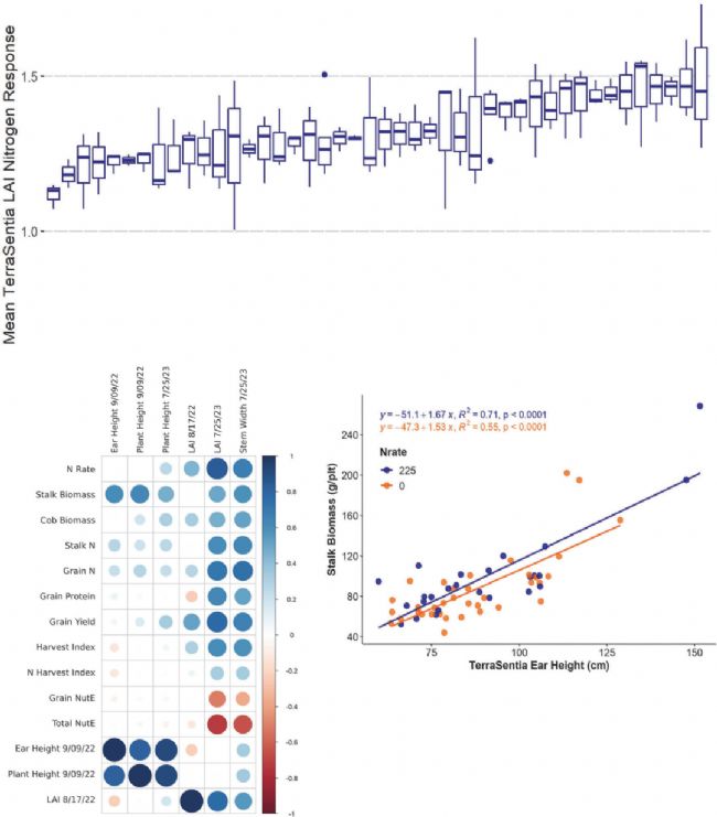 研究發(fā)現氮肥利用效率與作物產量性狀之間存在關聯(lián)。氮肥利用效率與葉面積指數呈強正相關(R²=0.957)。此外,機器人展現出預測莖稈生物量的潛力,通過建立的預測模型,可減少90%的人工測量時間