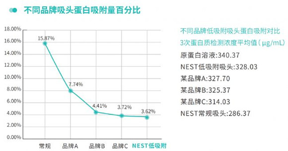 耐思低吸附吸頭相較于常規(guī)吸頭及其他品牌低吸附吸頭,蛋白質(zhì)吸附量最低。