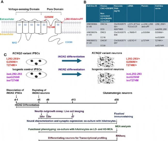 本研究從三名攜帶不同KCNQ2致病性變異(L292_L293delinsPF、G256W、T274M)的患者獲取成纖維細胞(Fig. 1),重編程為iPSC,利用CRISPR-Cas9構(gòu)建等基因?qū)φ。將iPSC分化為谷氨酸能神經(jīng)元,通過神經(jīng)突生長分析、RNA-seq、免疫熒光、微電極陣列(MEA)等功能測試,系統(tǒng)評估變異對神經(jīng)元結(jié)構(gòu)與功能的影響。