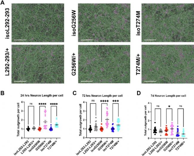 神經(jīng)突生長分析:G256W/+ 和 T274M/+ 在24h、72h和7天時神經(jīng)突長度顯著增加,L292_L293delinsPF/+ 無差異。