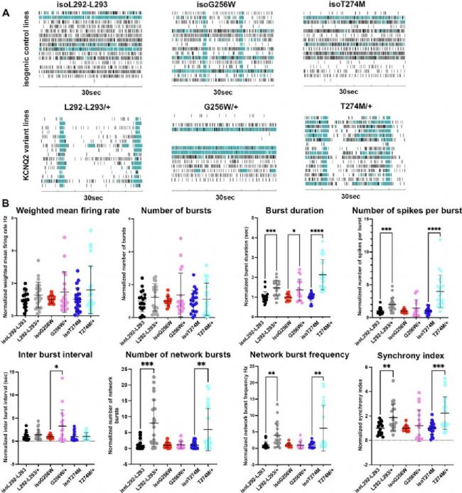 在微電極陣列(MEA)記錄中,所有三個KCNQ2變異系的爆發(fā)持續(xù)時間均顯著增加(Fig. 5)。L292_L293delinsPF/+ 和 T274M/+ 還表現(xiàn)出更高的網(wǎng)絡(luò)爆發(fā)頻率、同步性指數(shù)和每個爆發(fā)中的尖峰數(shù)。