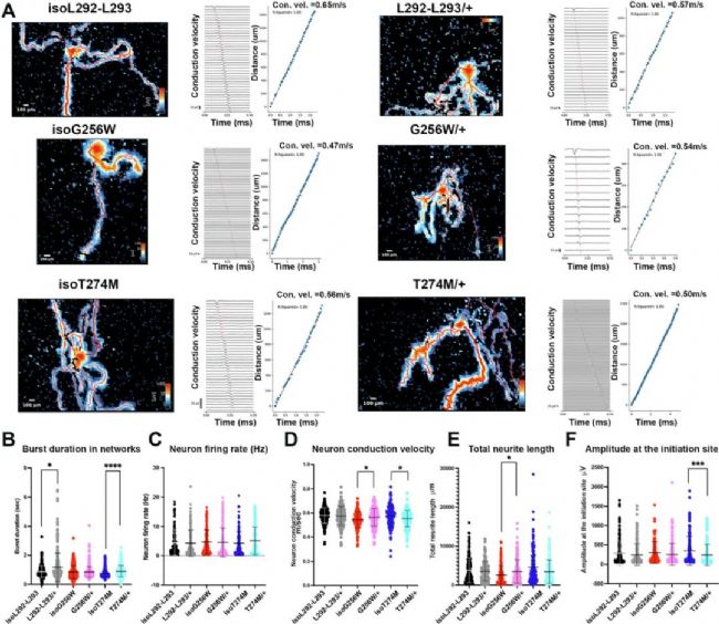 MEA分析顯示G256W/+ 傳導(dǎo)速度與神經(jīng)突長度增加,T274M/+ 傳導(dǎo)速度與振幅下降。