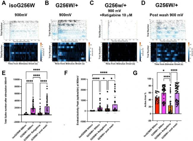 在900 mV電刺激下,G256W/+ 網(wǎng)絡(luò)的總尖峰數(shù)顯著增加,瑞替加濱(Retigabine,10 μM)可逆轉(zhuǎn)此現(xiàn)象(Supplemental Fig. 7),并在洗脫后恢復(fù),表明KCNQ2通道增強劑具有治療潛力。