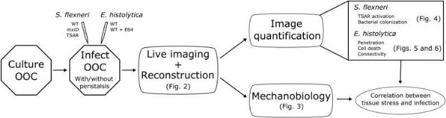 這項(xiàng)工作目的是在周期性變形條件下對(duì)芯片器官進(jìn)行四維實(shí)時(shí)成像,模擬腸道的蠕動(dòng)運(yùn)動(dòng)。除了實(shí)現(xiàn)可視化之外,這種方法還能揭示組織的流變學(xué)特性,為深入了解機(jī)械應(yīng)力的時(shí)空分布提供了新的視角。該研究以腸道屏障為重點(diǎn),展現(xiàn)了機(jī)械信號(hào)與病原體侵襲之間的相互作用,突出了溶組織內(nèi)阿米巴和志賀氏菌的致病機(jī)制。
