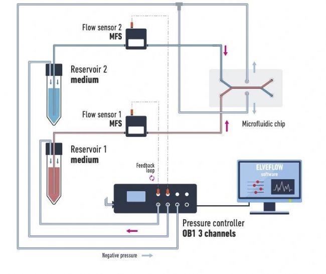 該微流控裝置通過(guò)點(diǎn)成Elveflow的 ESI 軟件進(jìn)行監(jiān)控,并使用