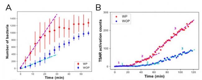 A) 生長(zhǎng)菌落中的細(xì)菌數(shù)量 (N=8),B) 作為其分泌系統(tǒng)標(biāo)記的 TSAR 激活細(xì)菌數(shù)量示例曲線 (N=4)
