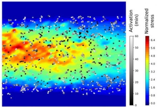研究人員通過(guò)比較單個(gè)細(xì)菌中 TSAR 的激活速度,來(lái)探究局部機(jī)械應(yīng)力對(duì)福氏志賀菌的影響。為了實(shí)現(xiàn)這一目的,利用藍(lán)色膜探針 Pro12A 計(jì)算出組織的應(yīng)力圖譜,并將其與單個(gè)細(xì)菌的 TSAR 激活情況進(jìn)行對(duì)比。如圖 6 所示,研究人員觀察到,在上皮應(yīng)力較高的區(qū)域,細(xì)菌的激活時(shí)間明顯更早。