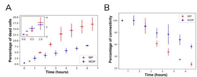 通過(guò)熒光顯微鏡分析發(fā)現(xiàn),與靜態(tài)組織(無(wú)蠕動(dòng),即 WOP)相比,在類變形蟲(chóng)感染 3 小時(shí)后,有蠕動(dòng)(WP)的情況下細(xì)胞死亡率增加了 10%(圖 7A)。為了研究組織損傷情況,研究人員還觀察了細(xì)胞的連接性,結(jié)果顯示在受到感染后約 3 至 4 小時(shí)出現(xiàn)了連接失效的情況(圖 7B)。
