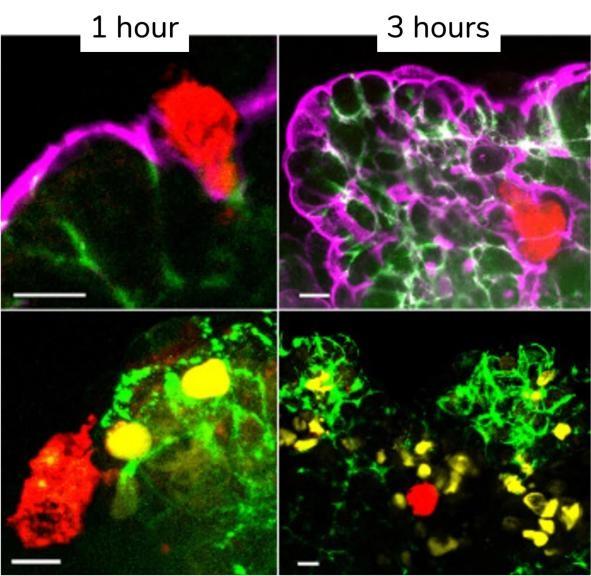 紅色:變形蟲(chóng);紫色:肌動(dòng)蛋白;綠色:E-鈣黏蛋白;黃色:死亡細(xì)胞(比例尺為20微米)。