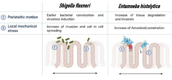 蠕動(dòng)在腸道組織更新過(guò)程中發(fā)揮著作用,它能促使上皮細(xì)胞和微生物群脫落。抑制胃腸蠕動(dòng)通常會(huì)導(dǎo)致細(xì)菌過(guò)度生長(zhǎng),這表明蠕動(dòng)運(yùn)動(dòng)對(duì)于降低感染風(fēng)險(xiǎn)從根本上來(lái)說(shuō)至關(guān)重要。然而,研究結(jié)果表明,盡管福氏志賀菌和溶組織內(nèi)阿米巴在大小、生命周期和感染機(jī)制上存在顯著差異,但蠕動(dòng)運(yùn)動(dòng)卻是這兩種病原體侵入的決定性因素。這些病原體已經(jīng)進(jìn)化到能夠利用結(jié)腸環(huán)境信號(hào),這意味著我們需要重新審視在靶器官生態(tài)位中研究宿主與病原體相互作用的方式。蠕動(dòng)運(yùn)動(dòng)和局部機(jī)械應(yīng)力對(duì)這兩種病原體感染的影響概述如圖 10 所示。