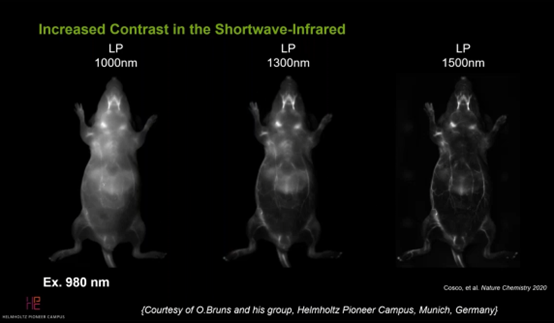 由于散射和吸收較抵,可以用它來觀察動物而無需切割打開它們,下圖可以觀察從1000nm~1600nm不同波長范圍內(nèi)所獲得的圖像下方的圖表信號減少,因為在1450nm水對光的吸收率最高,而組織中存在大量水分,另一方面增加的是對比度,因為所有生成的光子散射必須克服更長的路徑,因此被系收的概率更高。因此,相機主要檢測到的是直接從組織發(fā)射或離開的光,提供了更好的對比度。