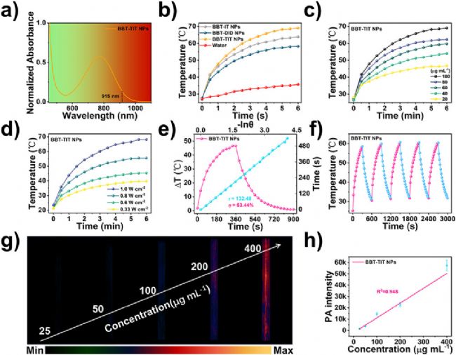 鑒于它們?cè)诮t外二區(qū)具有優(yōu)異的吸收特性,研究者進(jìn)一步研究了這些納米顆粒在水溶液中被915 nm激光照射時(shí)的光熱性能(圖4a)。以純水為對(duì)照,含BBT-IT NPs、BBT-DID NPs和BBT-TIT NPs(0.1 mg mL⁻¹)的溶液在照射6分鐘后,溫度分別升高至63.8℃、58.2℃和69.0℃(圖4b)。在不同納米顆粒濃度和激光功率密度下記錄的溫度變化曲線(xiàn)證實(shí)了光熱效應(yīng)與濃度和功率密度之間的正相關(guān)性(圖4c,d);诶鋮s曲線(xiàn)計(jì)算得到BBT-IT NPs的光熱轉(zhuǎn)換效率為63.95%,BBT-DID NPs為48.75%,BBT-TIT NPs為53.44%(圖4e)。值得注意的是,BBT-TIT NPs表現(xiàn)出出色的光熱穩(wěn)定性,在五次激光開(kāi)關(guān)循環(huán)后,達(dá)到的最高溫度變化可忽略不計(jì)(圖4f)。本文還評(píng)估了先導(dǎo)候選材料BBT-TIT NPs用于光聲成像的潛力。它們能夠產(chǎn)生強(qiáng)烈的近紅外二區(qū)光聲信號(hào),且表現(xiàn)出優(yōu)異的濃度依賴(lài)性(圖4g,h),表明其適合作為近紅外二區(qū)光聲成像的對(duì)比劑。在這三種材料中,BBT-TIT NPs展現(xiàn)出最具優(yōu)勢(shì)的性能,包括其在納米顆粒狀態(tài)下的最高量子產(chǎn)率、光照下的顯著升溫、良好的光熱穩(wěn)定性以及有效的光聲信號(hào)產(chǎn)生能力。這些特性使得BBT-TIT NPs成為后續(xù)活體成像與治療研究中極具前景的多功能制劑。