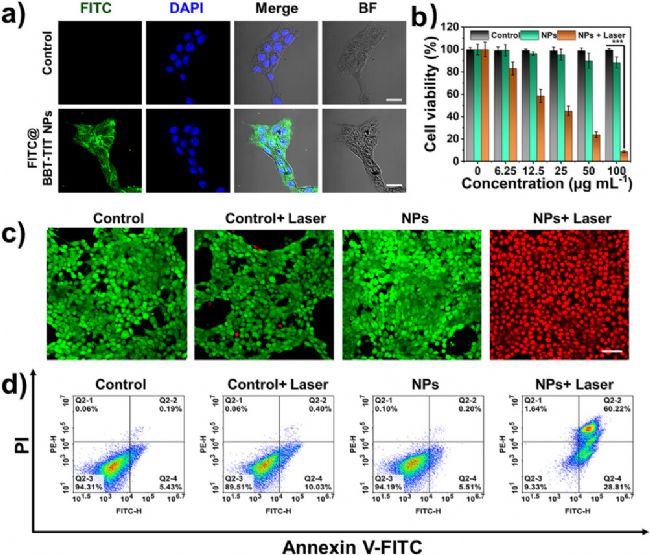 為評(píng)估BBT-TIT納米顆粒的體外抗腫瘤效果,本文采用4T1小鼠乳腺癌細(xì)胞系進(jìn)行了實(shí)驗(yàn)。為通過(guò)共聚焦激光掃描顯微鏡觀(guān)察細(xì)胞攝取情況,采用納米沉淀法將熒光染料異硫氰酸熒光素(FITC)與BBT-TIT共同封裝在DSPE-PEG2000基質(zhì)中制備納米顆粒。如圖5a所示,在4小時(shí)孵育后,4T1細(xì)胞質(zhì)內(nèi)可觀(guān)察到與FITC相對(duì)應(yīng)的亮綠色熒光,這表明納米顆粒具有有效的內(nèi)化能力。接著通過(guò)標(biāo)準(zhǔn)MTT法評(píng)估了BBT-TIT納米顆粒的細(xì)胞毒性。在沒(méi)有激光照射的情況下(圖5b),即使在100 µg mL−1濃度下,細(xì)胞存活率仍保持較高水平(≈96%)。該結(jié)果表明納米顆粒本身具有良好的生物相容性。然而當(dāng)使用915 nm激光(1.0 W cm⁻²,持續(xù)6分鐘)照射時(shí),觀(guān)察到顯著的劑量依賴(lài)性光毒性:細(xì)胞存活率隨納米顆粒濃度增加而急劇下降,在100 µg mL−1時(shí)降至約9.1%(圖5b),證明了BBT-TIT納米顆粒在體外具有強(qiáng)效的光熱治療作用。